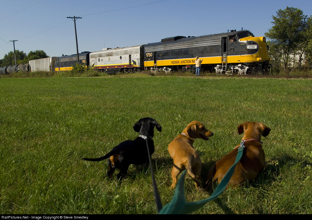 The photographers wife visits with the train crew of Dave and Doug Henry, as the re-lettered Keokuk Junction Railway FP9's wait a signal to cross the BNSF diamonds at Bushnell, Illinois on Monday afternoon. The Peoria & Western Railway lettering was replaced during the units 92 day FRA inspection, in an effort to avoid confusion, according to a KJRY official. The photographers three daschunds refused comment.