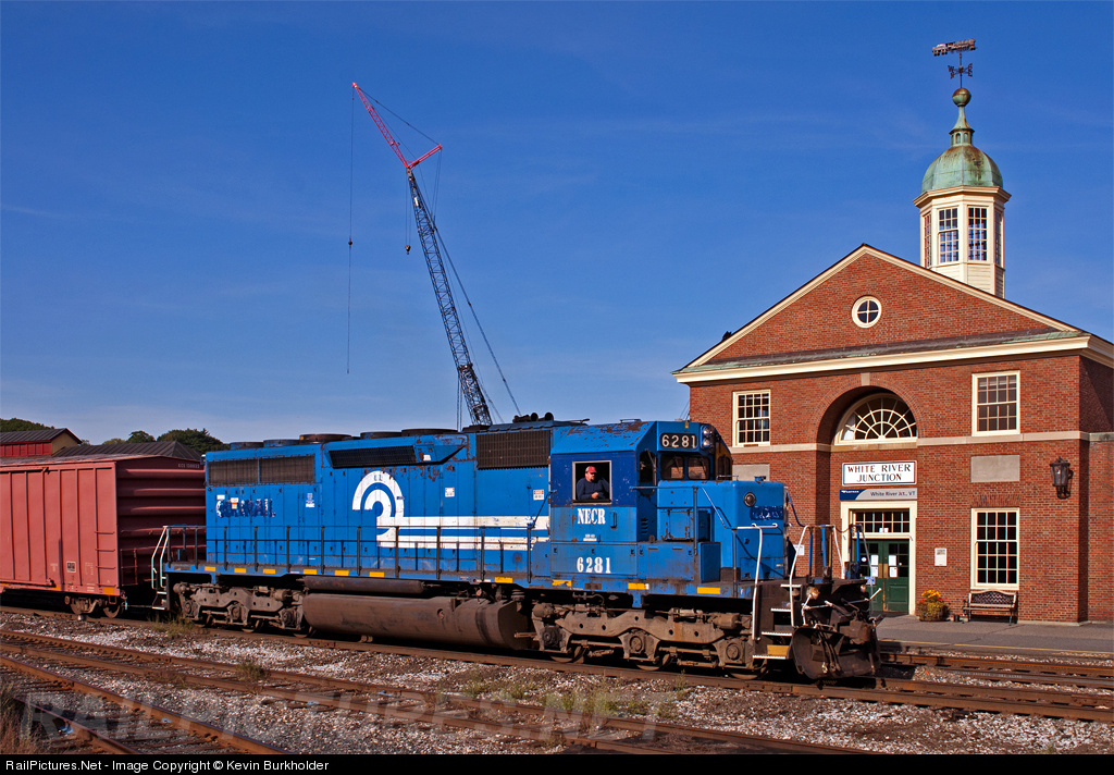 | A rare 6-axle for the White River Junction switcher brought ex-Conrail 6281, now NECR 6281, to town. The mostly intact Conrail scheme is seen switching in front of the majestic depot - complete with new Amtrak signage. The crane in the background is working on the Washington County Railroad's White River Bridge that failed during Irene. Many more photos at http://steelwheelsphotography.com. |