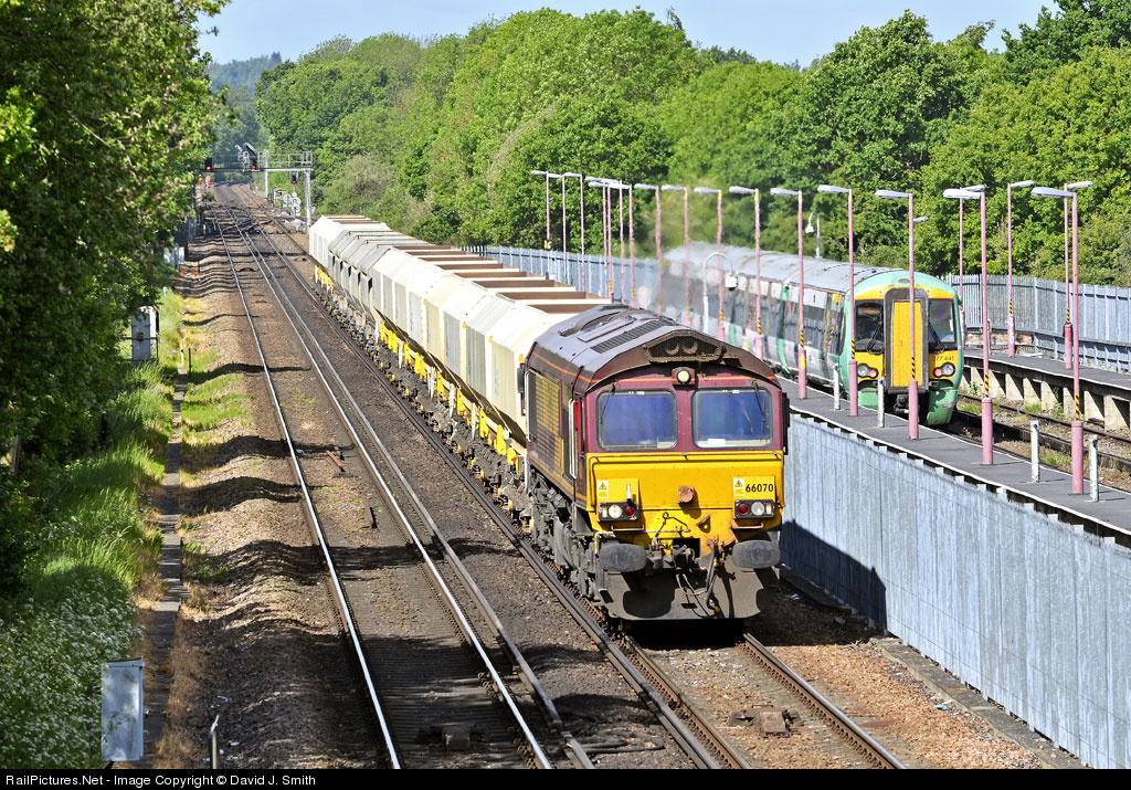 | A short train of empties,hauled by class 66 no. 66070 passes Tonbridge West Yard.Stabled in the sidings between duties is an Electrostar unit,377441. |