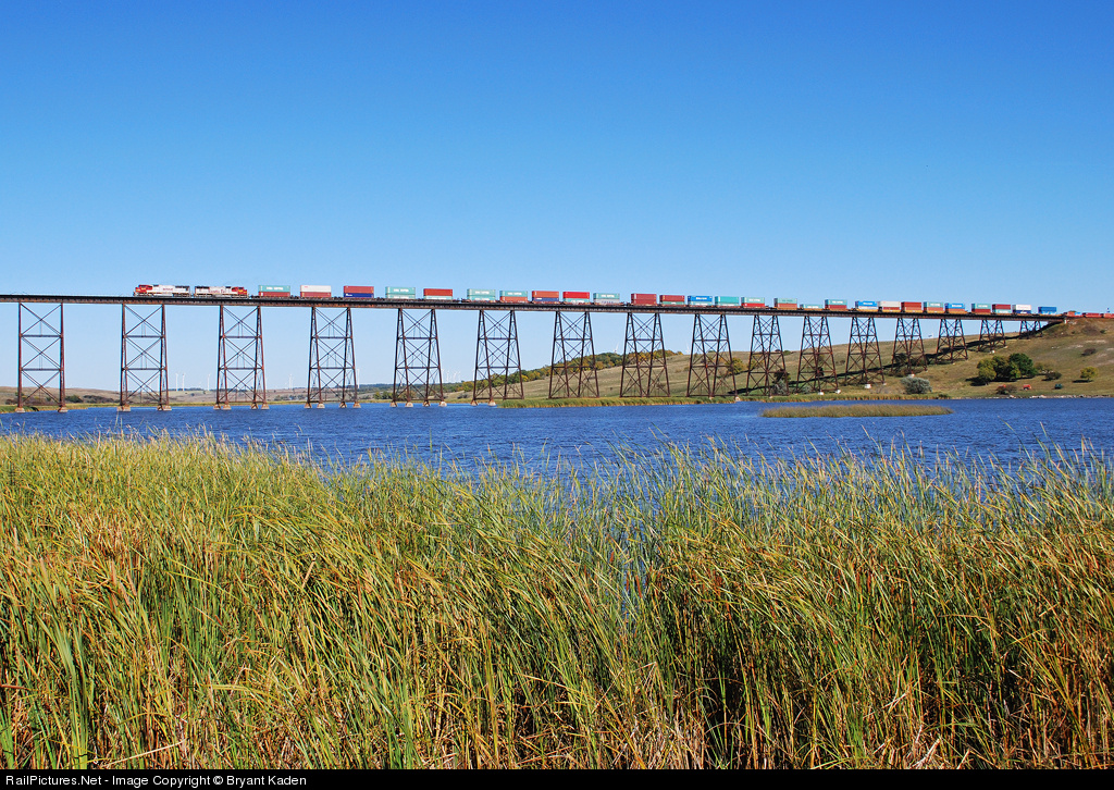 A westbound stack train rushes across Lake Ashtabula on the former GN mainline behind two Warbonnet SD75s.