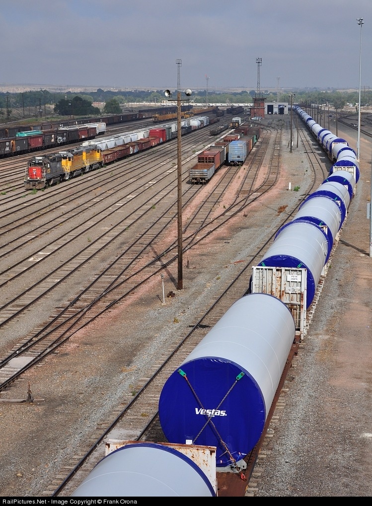 A former Cotton Belt GP40-2 will power today's Steel Mill Local as it prepares to blast off from the ex-Rio Grande yard in Pueblo while a Vestas wind tower train brought in the