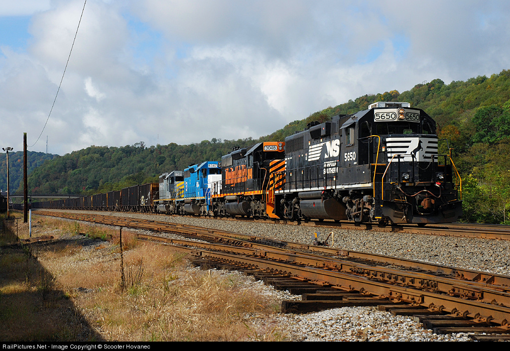 | 79 loads of iron ore for Sparrows Point slow to a stop at CP C. Up front are a couple of motors that don't often find themselves plying the Pittsburgh Line, NS GP38-2 5650 leads Wheeling and Lake Erie EMD's 3048, 6347 and 6349. |
