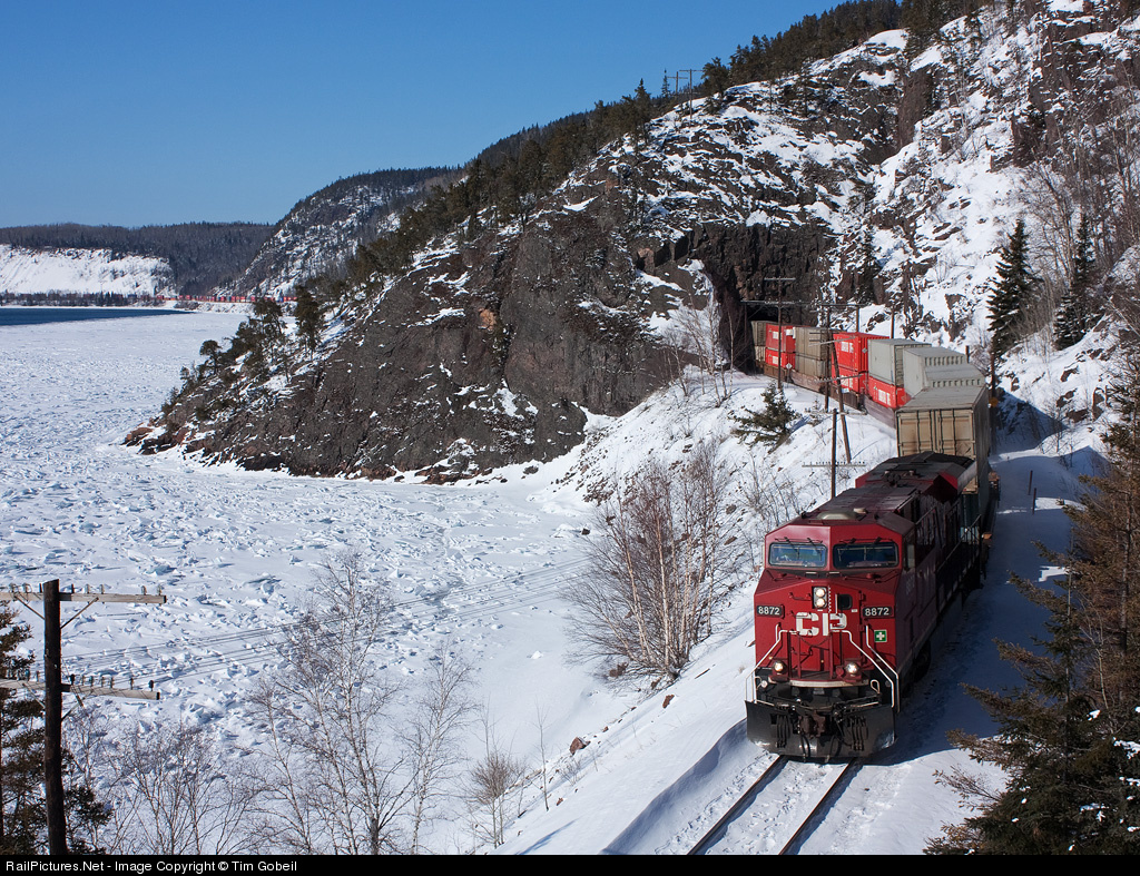 Winter has the shores of Lake Superior in full grip as CP 8872 leads train #112 out of the first of the 2 Cavers tunnels.
