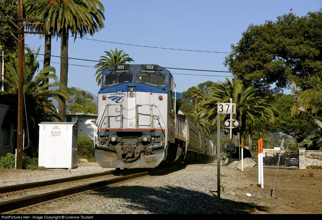 | Pushing a consist of three coaches and APCU 90230 in Cascade scheme, Amtrak 503 doing 60 mph when he pass Eucalyptus Lane downtown Montecito, Ca on a warm and sunny afternoon. |