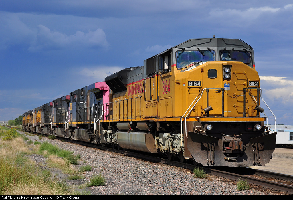 An EMD built SD9043MAC brings up the rear of this light engine move which includes three Southern Pacific AC4400s as the train patiently waits for traffic to clear north of here in Bragdon while an afternoon rain storm starts to turn the sky a nice dark blue.