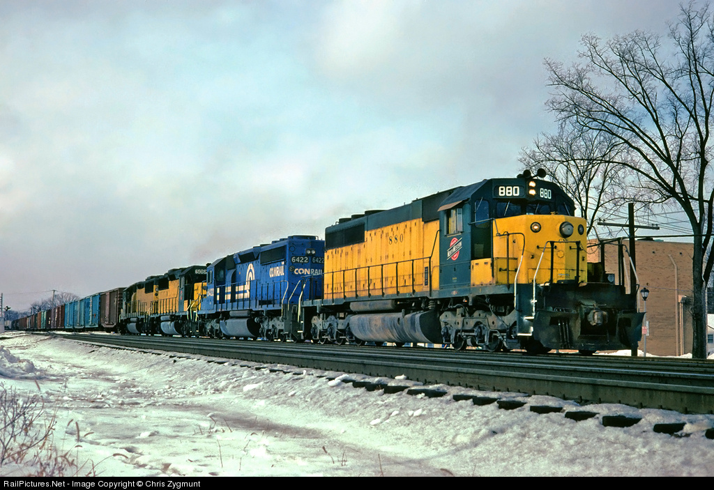 | A CNW SD40, CR SD40-2, and two CNW GP50's take a train west through Elmhurst. |