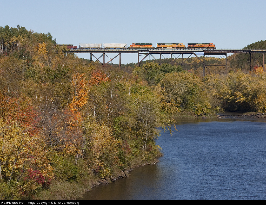 A northbound manifest flies over the Kettle River near Sandstone on a beautiful fall afternoon in northern Minnesota.