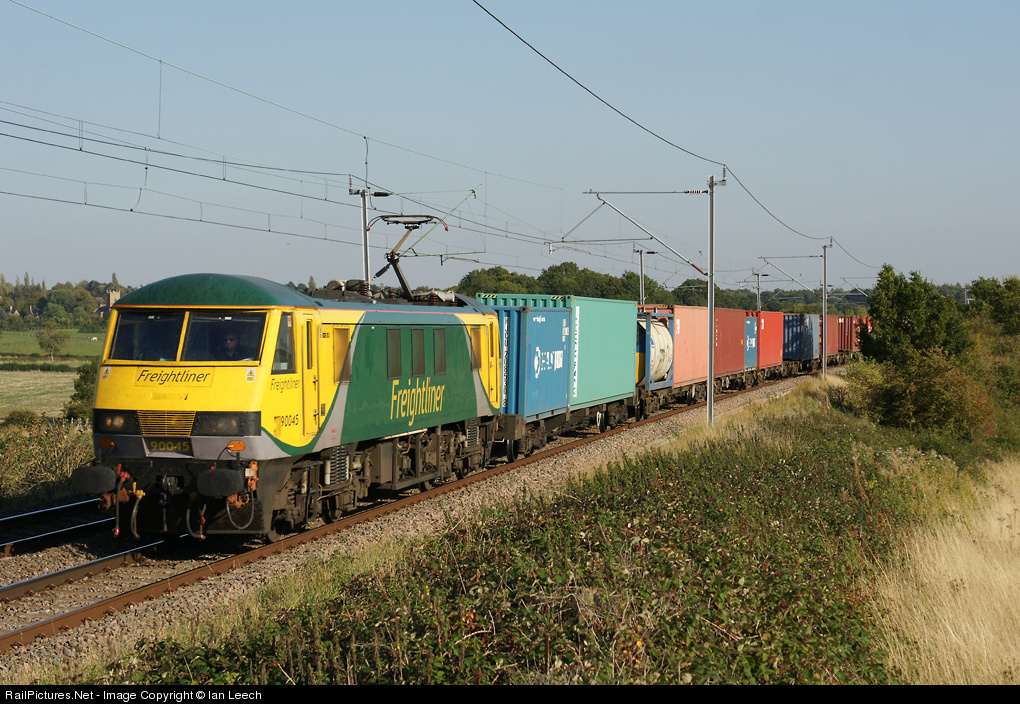 | Freightliner Powerhaul liveried 90045,powers a Ipswich to Crewe Basford Hall container train passed Church Brampton,Northamptonshire. |