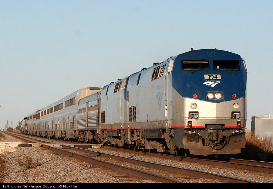 | The outbound Southwest Chief is wasting no time as it highballs down the former BN, through the town of Oneida. Four private cars are at the rear of today's train. |