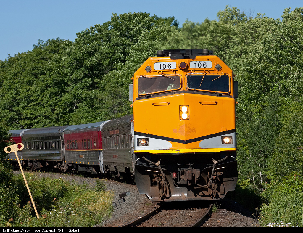 Still decked out in the aquired paintscheme, CN 106 leads some of the new Agawa Canyon Tour Train passenger equipment through a brief 10MPH speed restriction twisting through endless curves and Northern Ontario forests enroute to Sault Ste. Marie.