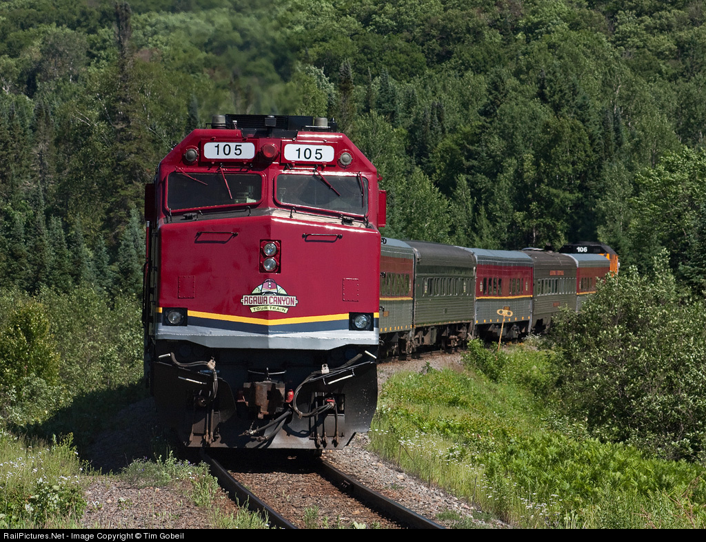 | Painted in the new tour train scheme, CN 105 shoves hard as the canyon tour train clears the south siding switch Wabos and disappears back into the Northern Ontario wilderness. Although this new paintjob is nothing special, it sure beats the old aquired scheme which can be seen on CN 106 just about to round the corner leading the train. |