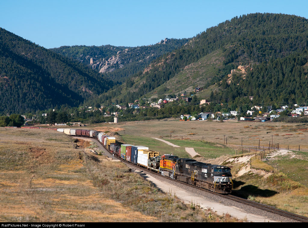 | I'd swear these things followed me here from New Jersey! A pair of NS Dash 9s (9614, 9583) lead BNSF 4393 on a northbound freight through Palmer Lake. While this isn't exactly what I had hoped to see on the Joint Line, I suppose it was interesting to see some eastern power leading a train in "out of place" surroundings. |