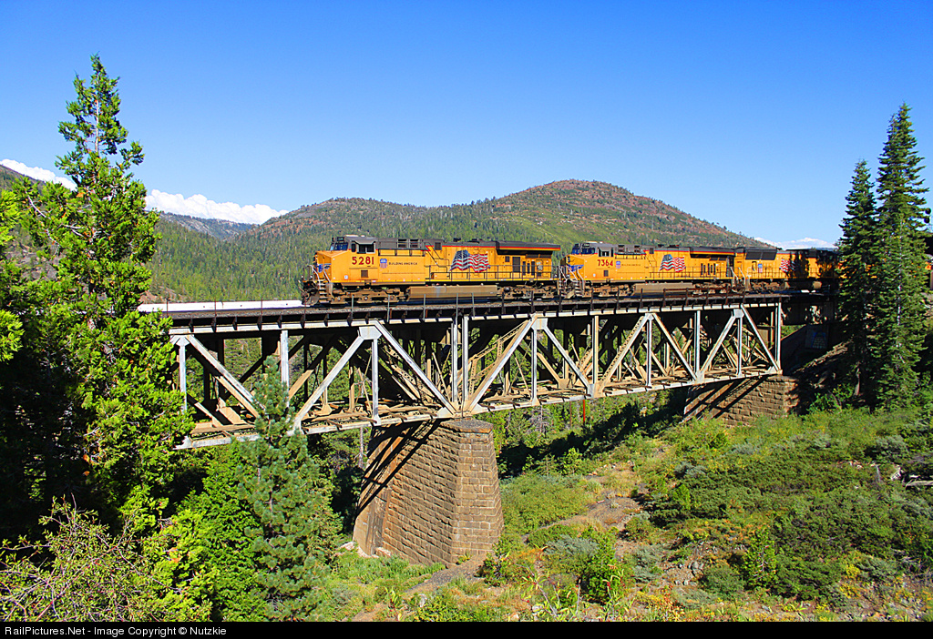 UP # 5281 leads a westbound stack train across the Butte Canyon Bridge on Union Pacific's Roseville Subdivision.