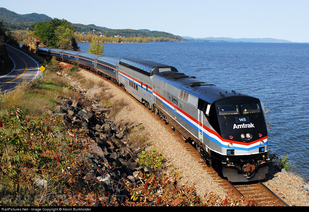 | Amtrak's Adirondack train 68 rolls along the shore of Lake Champlain with the Commemorative P42DC 145 and matching lounge dome 10031 "Ocean View" on Friday, October 7. Many more photos at http://steelwheelsphotography.com. |