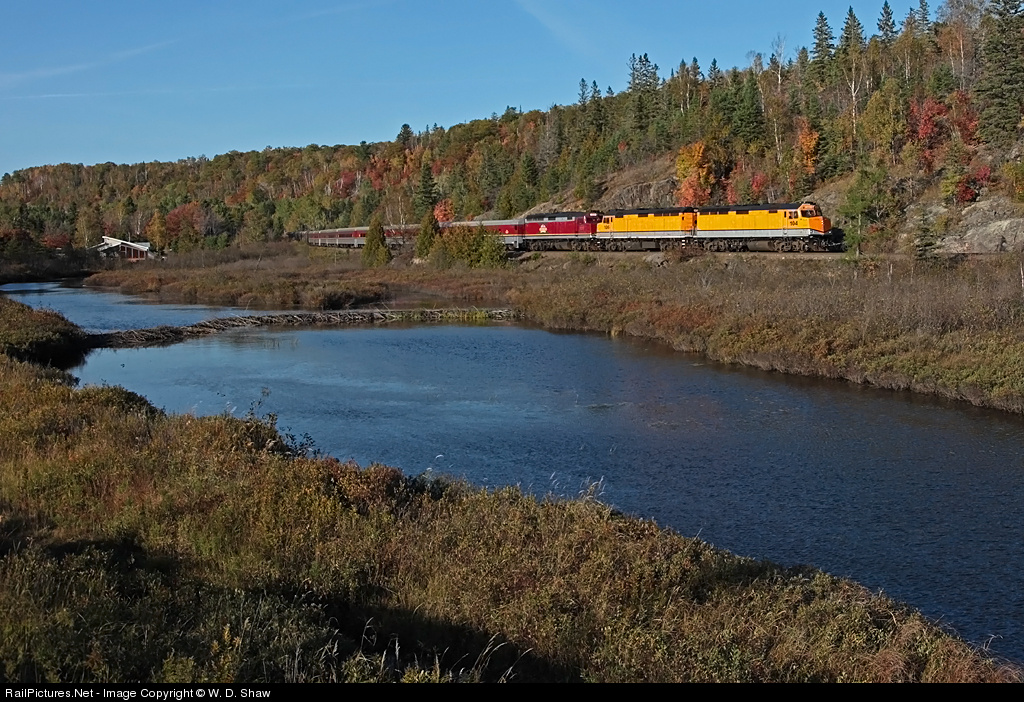 The returning Agawa Canyon Tour Train passes a scenic spot alongside Hwy 17 south of Heydon just north of the Soo.