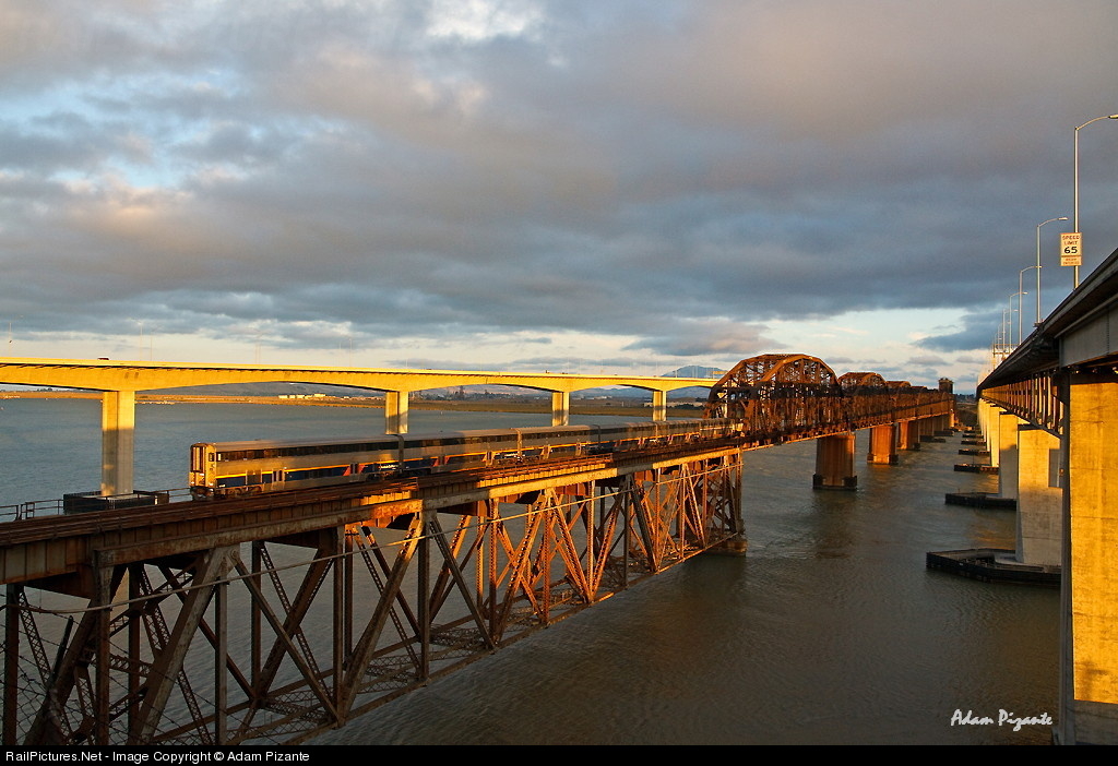 With the sun giving off its golden glow as it getting ready to set, an eastbound Capitol is crossing the roughly 83 year old railroad bridge over the Suisun bay.