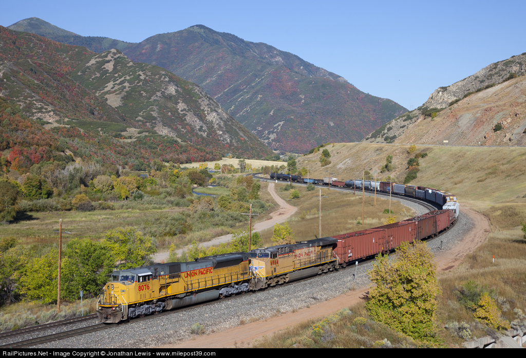 | UP SD90MAC 8076 is seen leading a short eastbound manifest from Salt Lake City (Roper Yard) to Denver (North Yard) at Spannish Fork Canyon on the climb to Soldier Summit - 25/09/2011 |