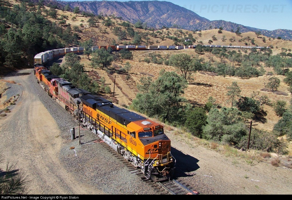 | A westbound BNSF intermodal train led by ES44C4 6639 continues its up hill battle as it approaches the west (north) end of Marcel siding. The grade can be seen in this shot as the train hugs the rig between Marcel and Tunnel 10. |