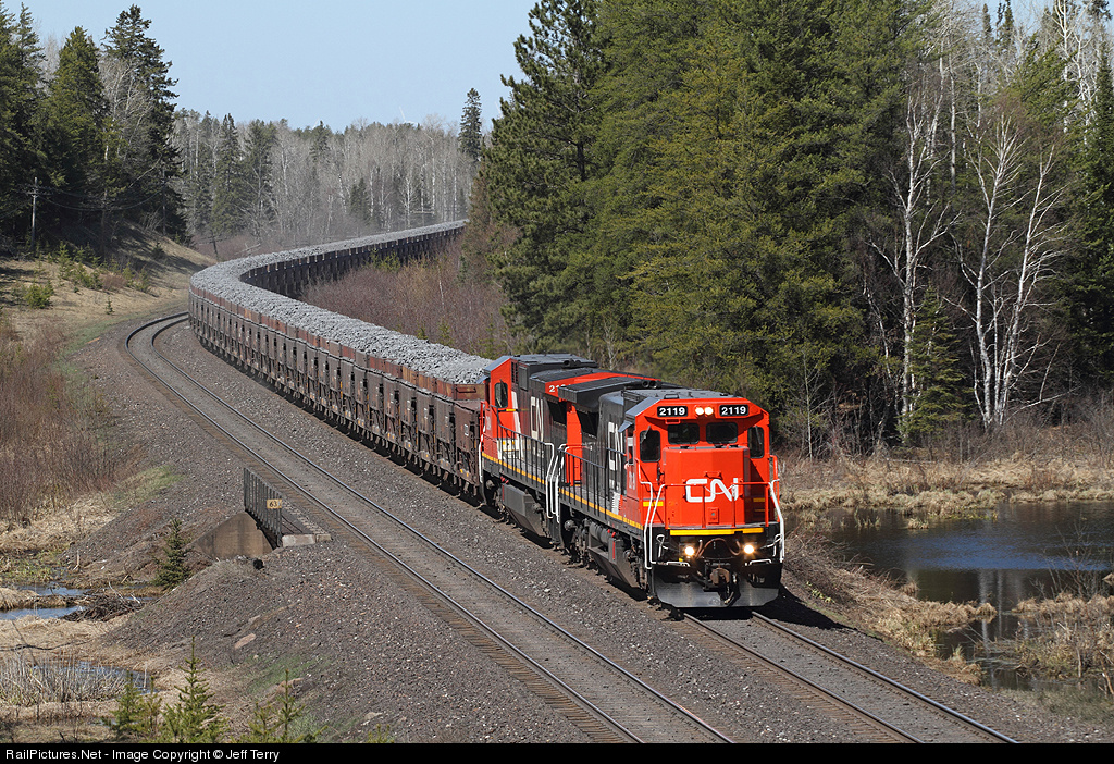| CN 2119 and sister 2104, working a Thunderbird between Forbes and Fairlane, provide some much needed color during Minnesota's brown stick season. |
