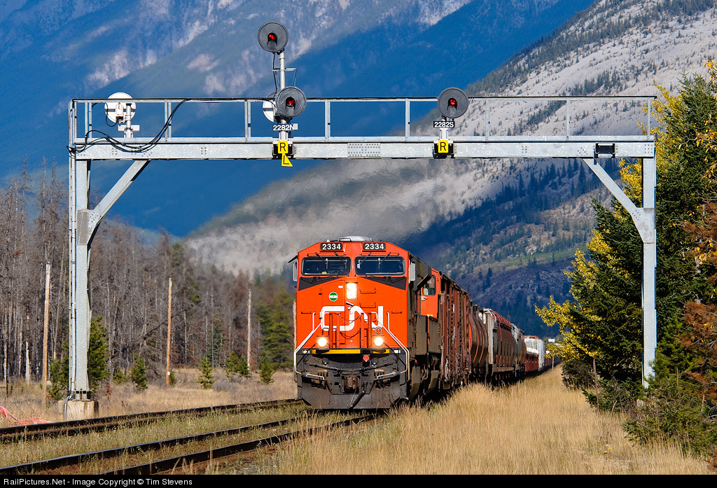 CN 2334 begins the final climb into Jasper with A411's freight bound for Vancouver. The approach signal to Henry House is one of very few signals with a bridge in Western Canada.
