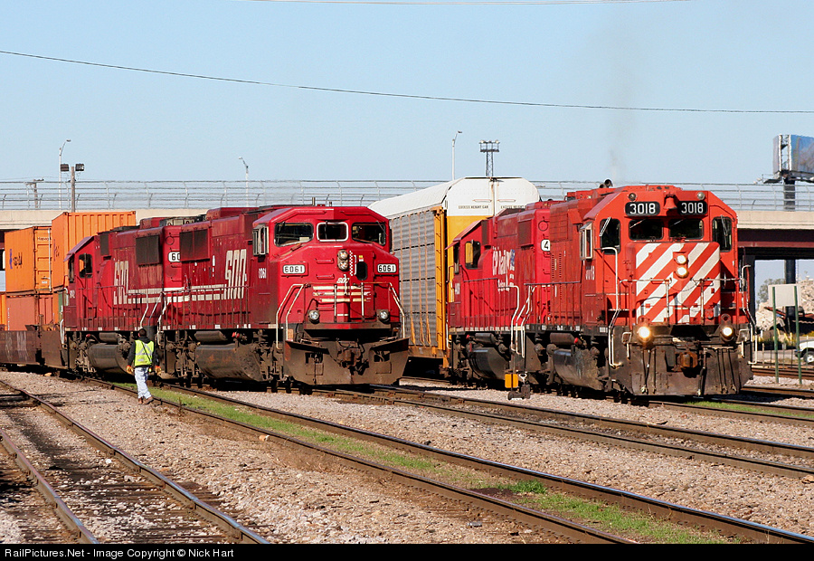 After bringing 182 into the yard, a GY12 crew is now in charge of the candy apple red Soo Lines, as they pass a pair of CP Geeps that are headed back into the yard.