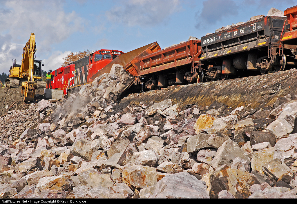 | Vermont Rail System and New England Central Railroad have teamed up to begin a rock runner train that delivers large rock from Colchester to Bethel, VT to aid in rebuilding VT Route 107 following Hurricane/TS Irene. RMPX GP40-2W 9457 is joined by VTR GP40 301 to haul 17 loaded rock cars - two conventional gons and 15 air dump cars. The train is seen dumping cars in Bethel. Many more photos at http://steelwheelsphotography.com. |