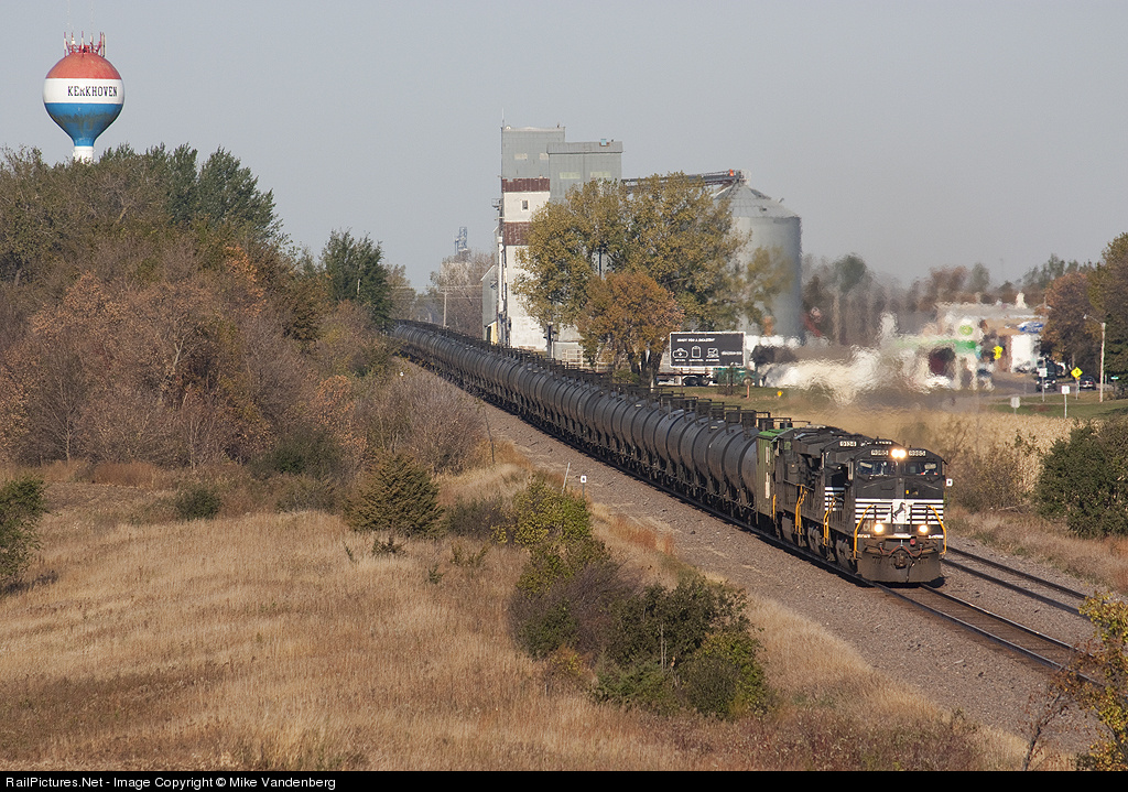 | On a brisk fall morning, a trio of Norfolk Southern units head for a crew change in Willmar with ethanol loads from Aberdeen, SD. This train will be handed over to Norfolk Southern in Chicago to continue its journey east. |