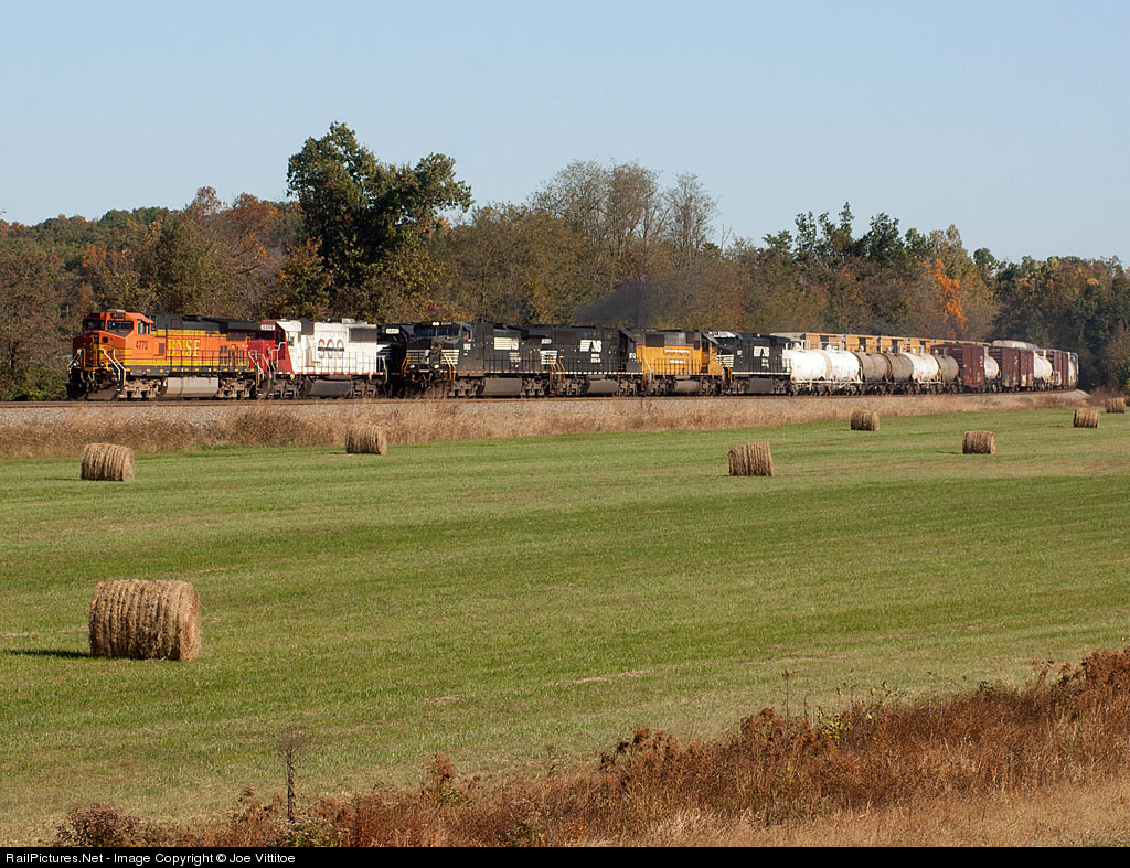 NS 177 with Dash 9 9183 runs around a BNSF lead 161 at Bowen as it heads south.