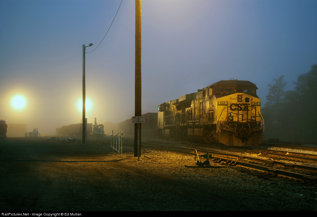 Just before sunrise, CSXT 644 rests on a freight track in the East Keyser Yard. Last evening, these loads were brought down 17 mile grade, and later this day the two engines will become helpers and shove the coal to a power plant.
