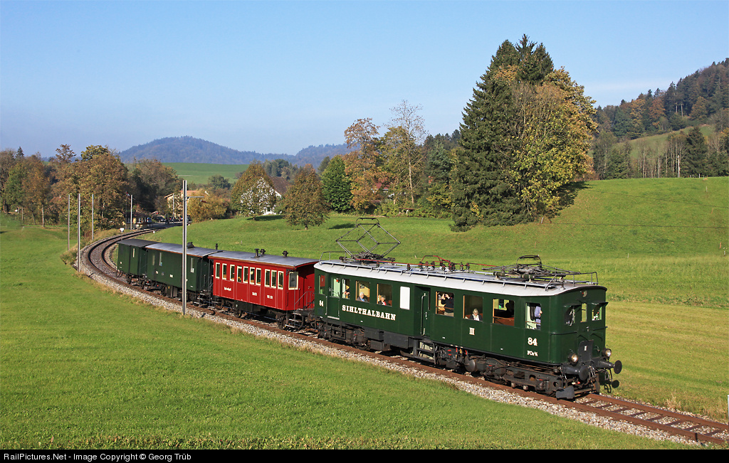 | Electric railcar FCe 2/4 84 of association Zürcher Museumsbahn (ZMB), built in 1924 for the Sihltalbahn Zürich Giesshübel-Sihlbrugg, with a dining car train from Bauma to Zürich near Neuthal. |