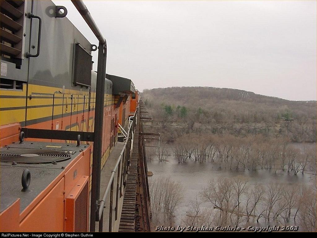 BNSF 4966 travels across the high bridge over the St. Croix river during the 2001 Mississippi flood.