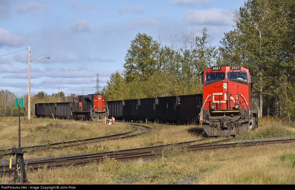 | Empty coal train with CN 2527 and CN 2582 on the nose and CN 8953 on the rear. This train will be "normalized",(CN 2527 and 2582 will back onto 8953), before leaving McKellar island. |