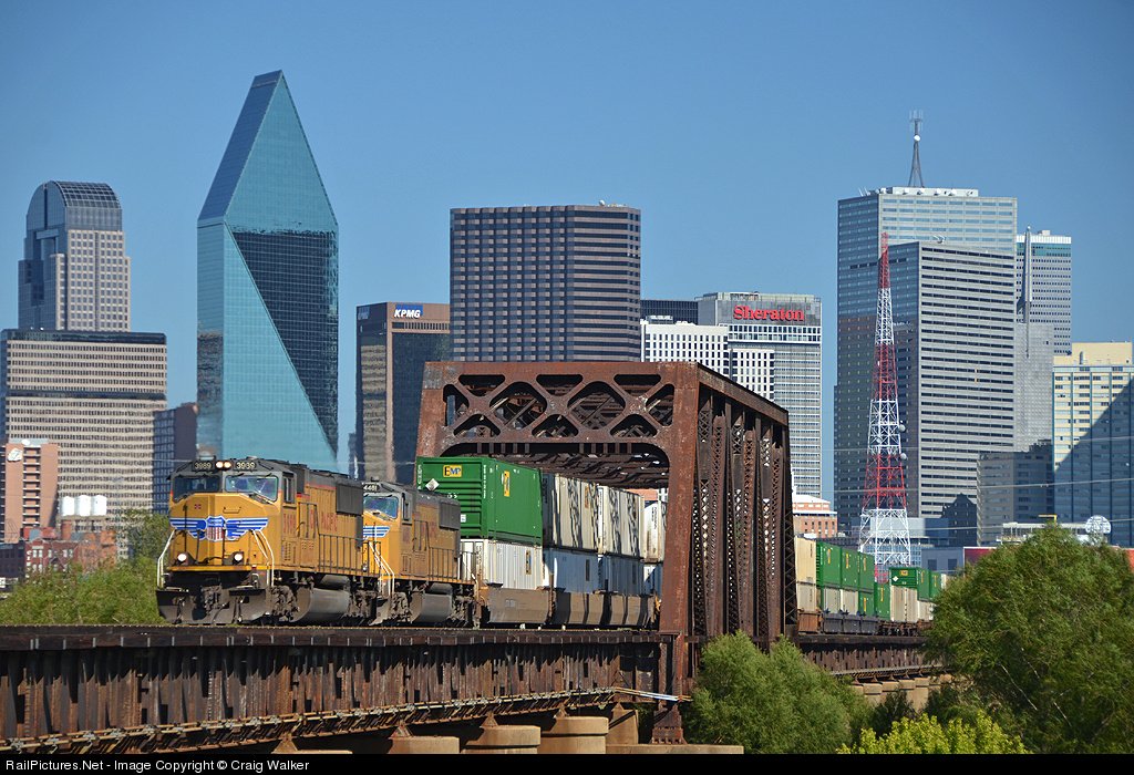 With the city of Dallas, Texas, looming in the background, a pair of Union Pacific SD70Ms (3989 and 4481) are in charge of train IMQMX 16 (an intermodal train running from Mesquite TX to Mexico City). The train is crossing the wide, but at this time dry, Trinity River.