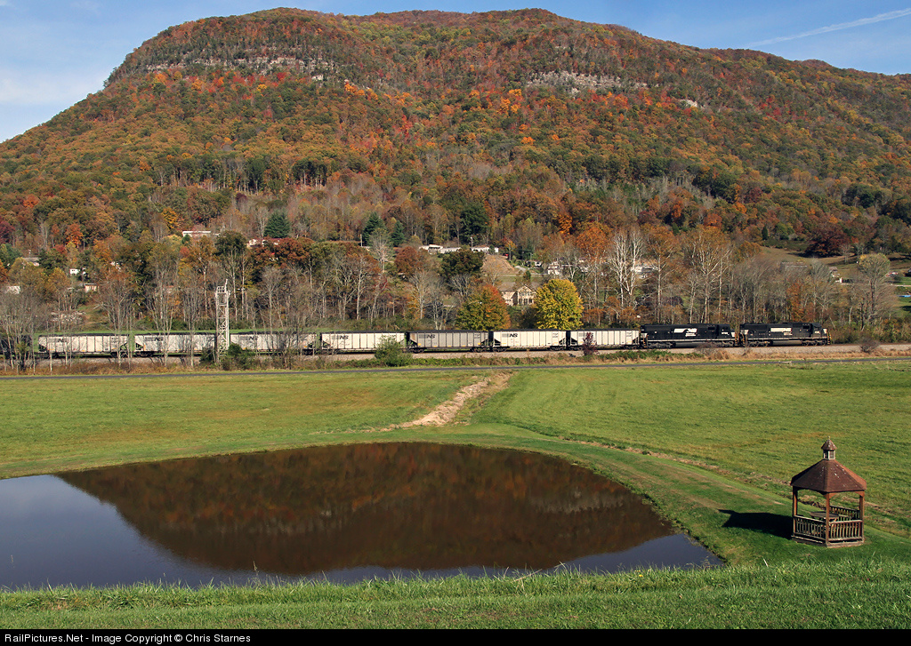 Eastbound NS coal loads roll by the signal at Jasper on a beautiful fall afternoon in the mountains of Southwestern Virginia.