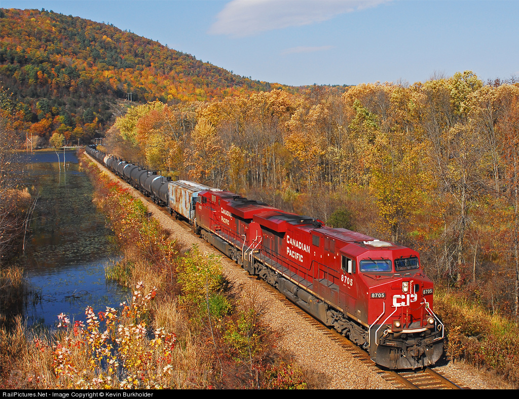 Canadian Pacific Railway's latest addition to the D&H North End portfolio is unit crude oil from Stampede, ND to Albany, NY. On October 24, the 80 mostly-blue-ended tanks are obediently trailing the CPR ES44ACs 8705 and 8785 near Port Henry, NY, where the remnants of the 2011 foliage season are still holding on. Many more photos at http://steelwheelsphotography.com.