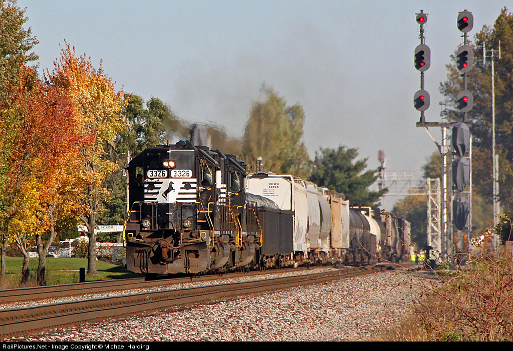 | The old signals on the right are in their last day of operation before the major cut over scheduled for 10/25/11 that will take a host of old signals out of service around town. A classic looking 303 with sequentially numbered high hood NS SD40-2's (3325 trailing) roll by the former NKP Signals. |
