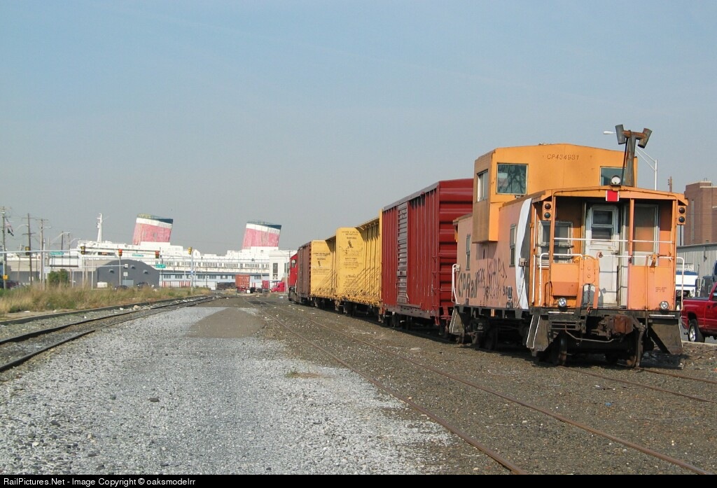A truly international view: Canadian Pacific Railway caboose 434931 sits on the tail end of the CP Local that services Delaware Avenue along Philadelphia's waterfront, while in the background floats the soon-to-be-restored cruise ship SS United States.