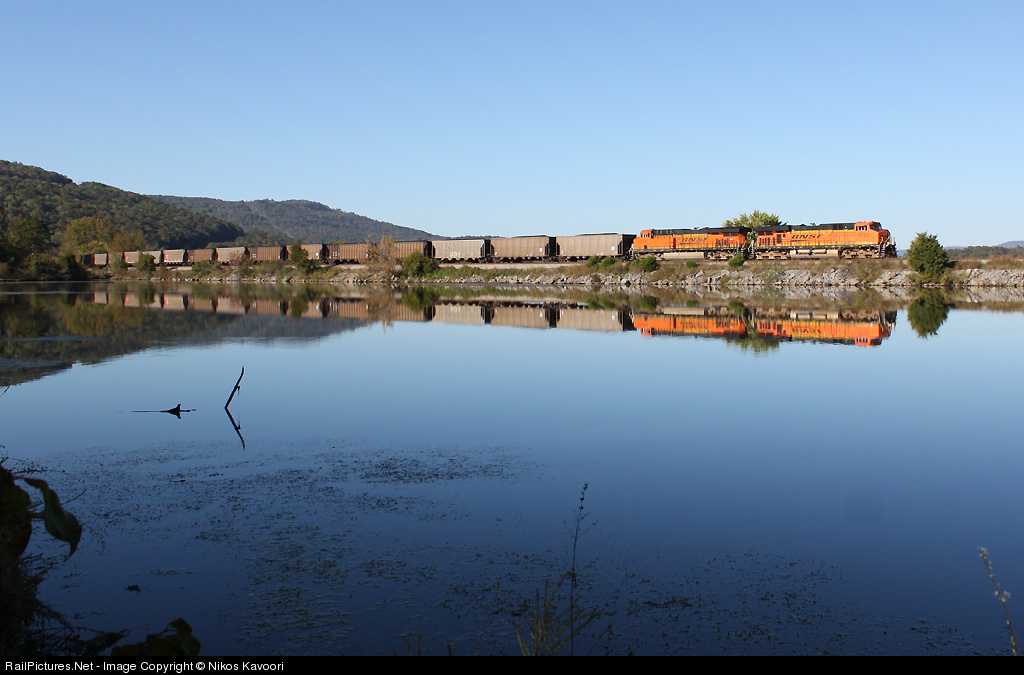 | Two clean BNSF ES44's lead a loaded Scherer Coal train along the NS-CSX joint line along beautiful lake Nickajack. While I could care less about the BNSF power in Atlanta, I was very happy to see it on this bright Sunday morning as it stands out much better than NS black or CSX dirty blue. |