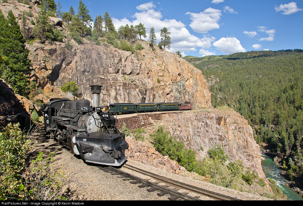 400 feet above the Rio de las Animas Perdidas, a Denver & Rio Grande Western mixed train crawls along the man-made cliff that has become known simply as: "The High Line." Led by one of the 3 surviving Alco K-28 Locomotives, the Durango & Silverton's Fall Photo Special re-creates the line's rich history for the cameras on a sunny Sunday afternoon in September. Of note in the consist are the RPO car and two coaches, which have been painted in the D&RGW legacy green with gold lettering since 2010. Alas, the D&S has indicated that 2011 would be the last year that these special cars would appear in this color. Having ridden on several excursions and charters with them, I am one customer who sure hopes they have a change of heart.
