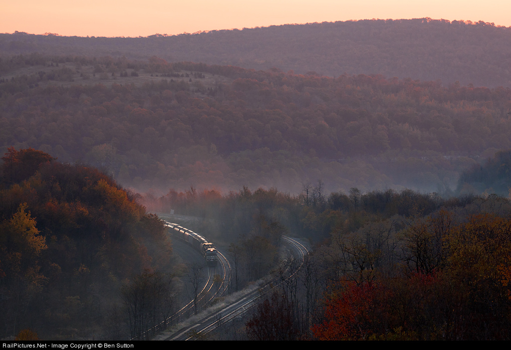 Frost has filled the hills on both the trees and ground (Frost on the distant mountain where Benny Curve is), combined with fog and some fall color makes this scene a very splendid one to wake up too. An early westbound freight cuts through the frozen fog, grinding it's way west and about to dip into the deep abyss of the mountain I am standing on. Crisp air fills the world around me as I wander and gaze upon the scene as the sun peeks over the Alleghenies out of frame on the right. Good morning, Autumn.
