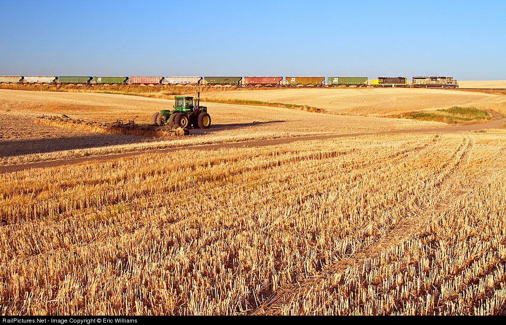 | While the tractors are idled for the day, the Eastern Washington Gateway pushes on to get the train to Cheney before the hours of service law catches the one-man crew. In an irony of economics, the farmer has state of the art efficient machinery, while his crop is carried by relics to be cost effective on a line that doesn’t support many carloads per year. A 40-year-old SD45 and 58-year-old GP7 team up to pull cars built 35+ years ago on 85lb rail laid a century ago. |