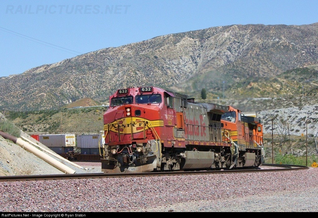 | One of the old Superfleet Dash-9s 632 decends the Cajon pass and heels to the large curve that swings trains out of Swarthout Canyon and into the Blue Cut area on Cajon. Today the old 600's (and many others) are banned south of Barstow on the BNSF due to EPA regulations. |
