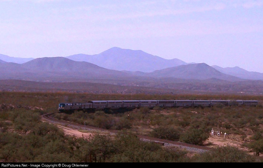 | The eastbound Sunset Limited rounds Buell curve, ready to roll under I-10 between Pantano and Mescal, Ariz. Digital camera shot. |