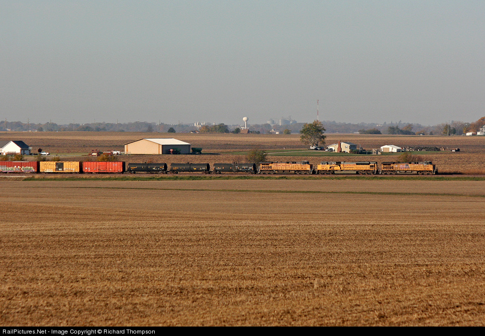 This northbound UP mixed freight is currently awaiting the passage of a southbound before proceeding onto the single track. The small burg of Princeville, Illinois can be seen on the horizon in the background.