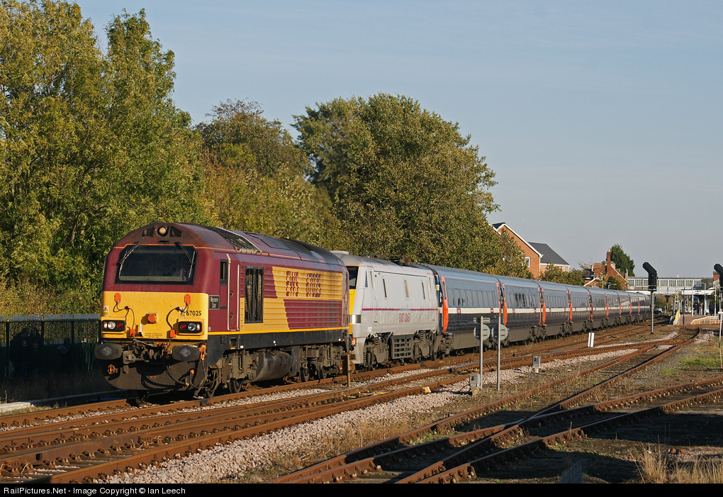 | DB Schenker 67025 'Western Star' hauls a diverted London Kings Cross to Leeds East Coast Trains service through Sleaford.The train came off the East Coast mainline at Peterborough because of engineering works just south of Newark. 91122 is the East Coast electric behind the Class 67 |