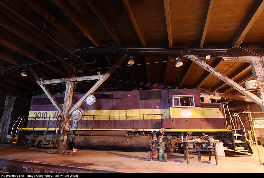 | Sleep With One Eye Open- This geep had been stored in the old SOO/WC Fond du Lac roundhouse for almost a year. The problem is she's starting to loose parts, to keep the rest of the fleet running in this parts starved roundhouse. So the WC 3010 sleeps with one eye open. Lucky for it, I just take pictures. |