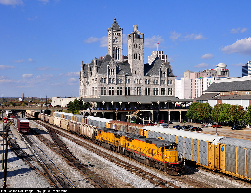 | Originally built in 1898 and officially opened to the public on October 9th 1900, the late-Victorian Romanesque Revival architecture on Nashville’s Union Station provides a fitting backdrop for trains passing through the area as two former Union Pacific Dash 8 locomotives pull a loaded G794 into Kayne Avenue Tower for a crew change while L284 waits on the track 2. |