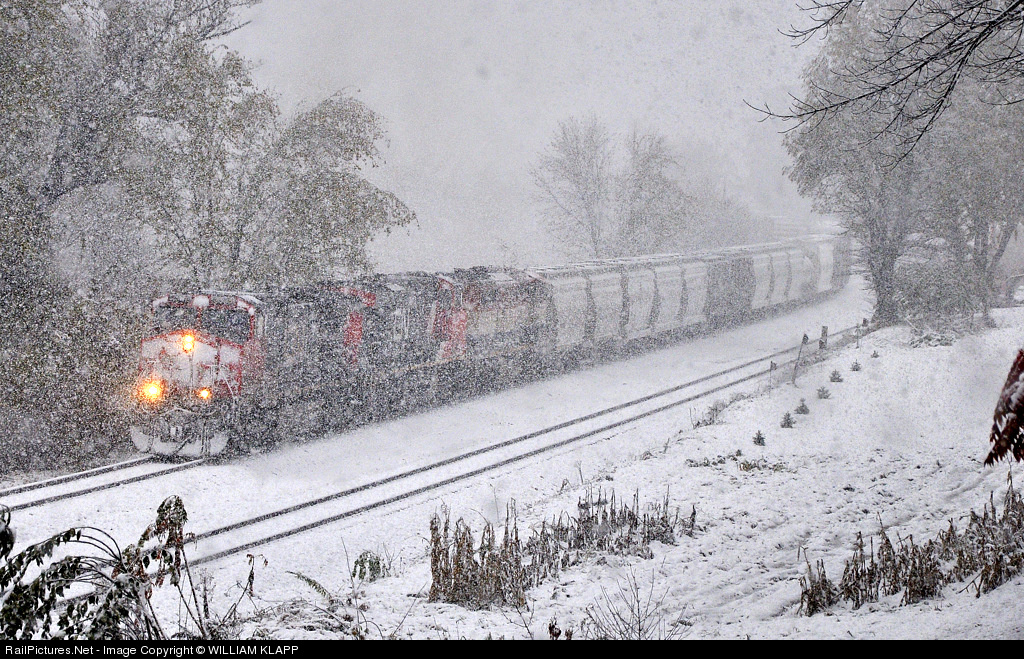 Southbound on North Boyles siding in heavy snow , first of season , with rare appearance of CN & BC engines , at the time up to 12 inches of snow was expected.