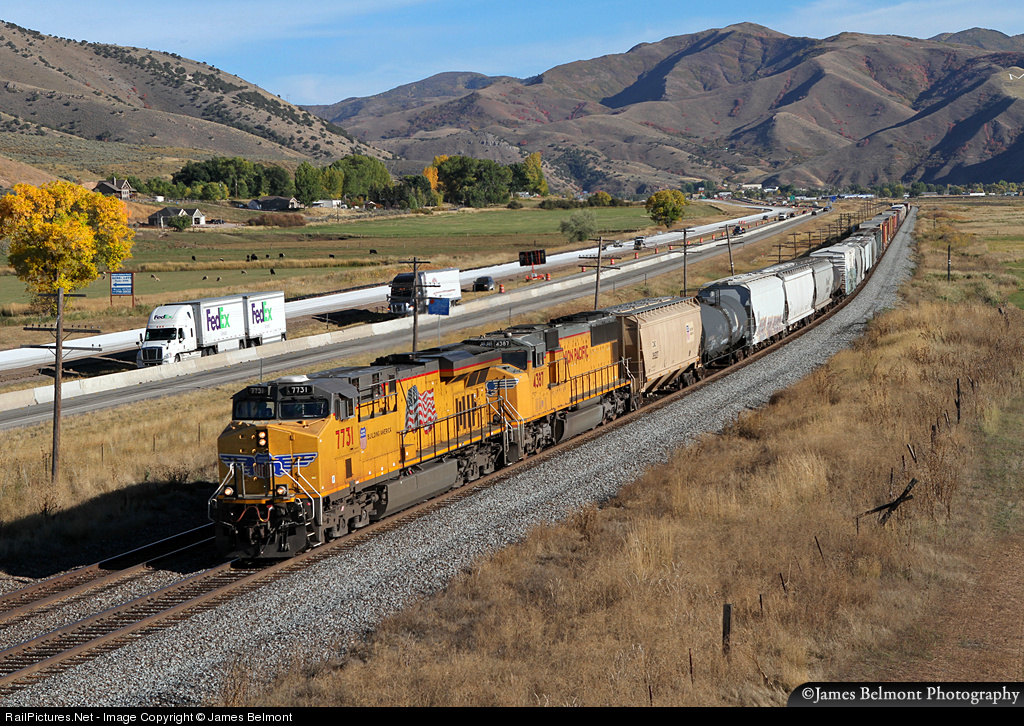 | Union Pacific's North Platte, NE to Roseville, CA manifest glides down the Evanston Sub at Morgan, Utah. |