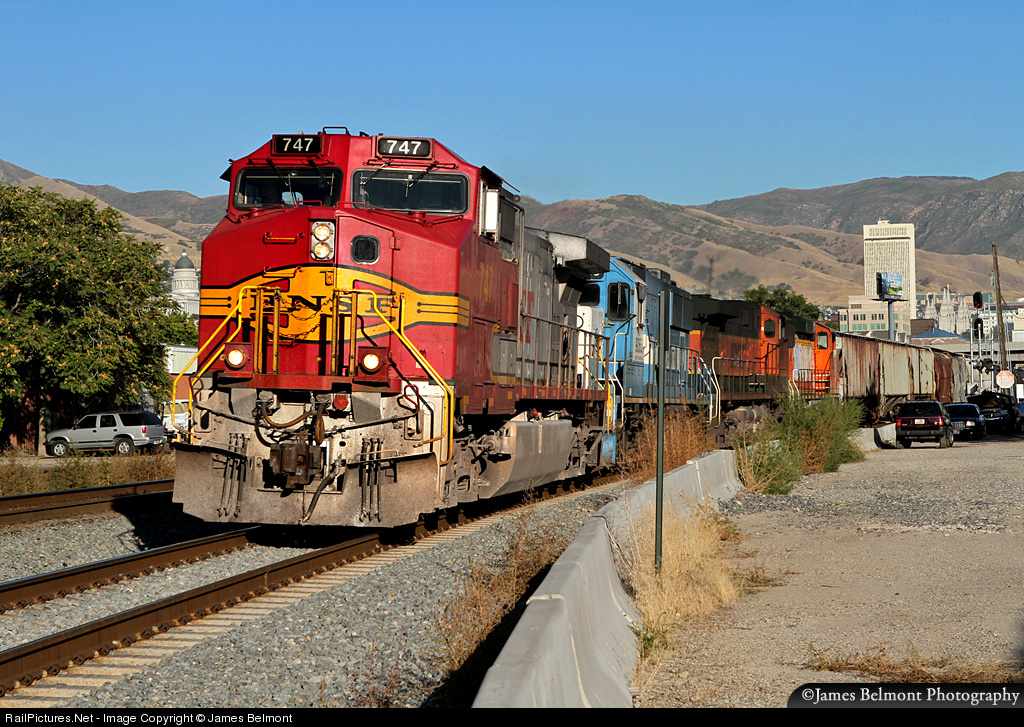 | With a UP crew on board, a BNSF Railway Provo, UT to Stockton, CA trackage rights manifest departs Salt Lake City for Nevada and California. |